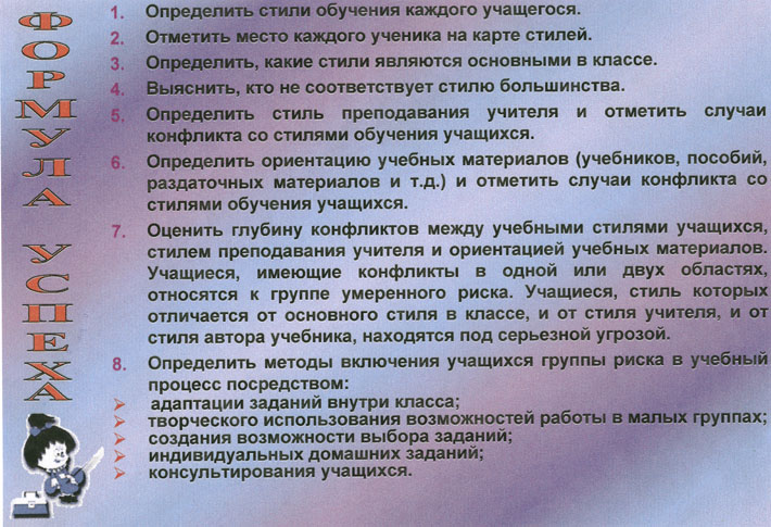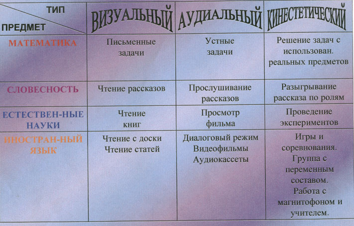 Способы дифференциации могут сочетаться друг с другом, а задания предлагаются ученикам на выбор. Умело организованная внутренняя дифференциация позволяет абсолютному большинству школьников добиваться успехов в учёбе без ущерба для здоровья, не подавляя других интересов и склонностей. Почувствовав уверенность в своих силах ученик способен двигаться дальше. Как считает американский психолог Бетти Лу Ливер учащихся класса можно разделить на визуальный, аудиальный и кинестетический типы. Учащимся визуального типа необходимо обращаться к зрительной памяти, так как им необходимо всё «видеть». Им лучше давать письменные инструкции, чем устные рекомендации. Визуальный тип учащихся учится посредством зрительного восприятия информации. Учащиеся аудиального типа воспринимают учебный материал на слух. Они предпочитают устные объяснения. Аудиальный тип учащихся учится посредством восприятия информации на слух. Кинестетикам необходимо движение. Кинестетический тип учится на собственном деятельностном опыте. Учителю необходимо адаптировать свой учебный план и виды деятельности на уроке. (Приложение 1)