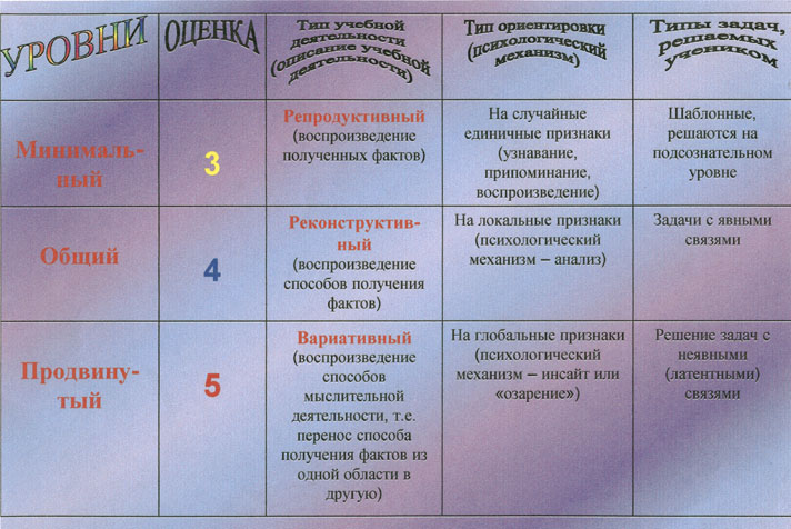 Минимальный уровень - репродуктивная деятельность (по Л.С Выготскому), т.е запоминание и воспроизведение фактов. Этот уровень соответствует первому типу ориентировочной деятельности (по П.Я.Гальперину) - ориентировке на случайные единичные признаки. Психологический механизм - узнавание, припоминание. Этот уровень соответствует оценке «3».
