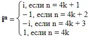 i1 = i; i2 = - 1; i3 = i2 · i = - i; i4 = (i2)2 = (- 1)2 = 1; i5 = i4 · i = I; и т.д. Заметив повторение через некоторый интервал ответов, запишем общую формулу:
