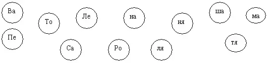 Учитель раздаёт им карточки со слогами, каждый должен найти себе пару, чтобы при сложении слогов получилось имя.