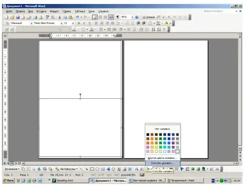 Используя кнопку Прямоугольник на панели Рисование чертим верхний прямоугольник на пол листа (если при нажатии на эту кнопку появляется рамка Вставка рисунка - необходимо нажать на клавишу Esc). Заливаем (раскрашиваем) его при помощи кнопки Заливка " Способы заливки " вкладка Градиентная " Заготовка " название заготовки "Поздний или ранний закат" " Тип штриховки Горизонтальная (объект должен быть выделенным);
