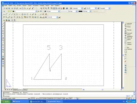 Здесь, помимо опции Undo (Отменить), появилась опция Close (Замкнуть). Если имеется выбор из нескольких опций, то они разделяются символом "/". После ввода на клавиатуре С (3), и нажатия клавиши <Enter> AutoCAD нарисует еще один отрезок, идущий из конца предыдущего отрезка в начало первого (см. образец). Если вы не хотите строить замыкания отрезков, а хотите просто завершить команду LINE (ОТРЕЗОК), то нажмите клавишу <Enter>, которая всегда является признаком конца циклических операций. Разумеется, можно было нажать <Enter> после ввода второй точки. Тогда третий отрезок не был бы построен и команда LINE (ОТРЕЗОК) завершилась бы, а в командной строке появилось бы приглашение Command: (Команда:) (что всегда означает правильное завершение любой команды в системе AutoCAD.