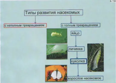 (Страница доски 4 - схема "Типы развития насекомых") - ученики записывают в тетрадь только верхнюю часть схемы (нижняя часть - закрыта электронной непрозрачной шторкой).