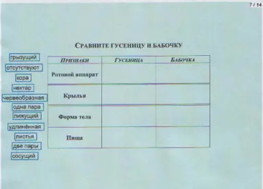 Задание. Сравните гусеницу и бабочку. Выделите и перетащите с помощью электронного пера термины в соответствующую ячейку таблицы (страница доски 7).
