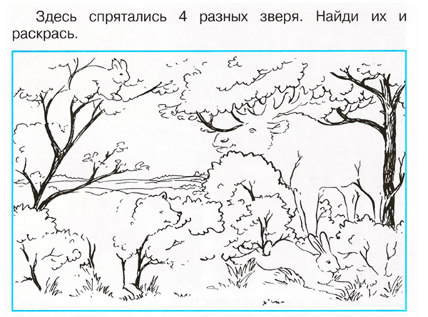 - Возьмите карточки № 4 (Приложение 4). Найдите и раскрасьте цветными карандашами 4-х животных, спрятанных здесь, назовите их (лось, белка, заяц, медведь) (Приложение 6 Слайд 13)