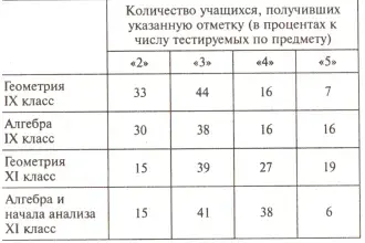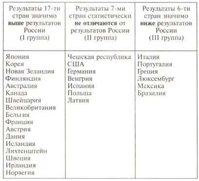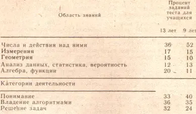 Как видно из таблицы, расхождения между программами для 13-летних школьников в нашей стране и содержанием теста весьма значительны. На уровне 9 лет расхождения были не столь значительны.