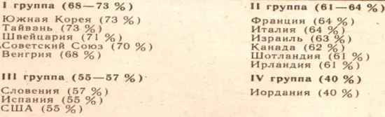 Все страны можно разделить на 4 группы, в каждой из которых результаты не имеют существенных различий. СССР вошел в группу пяти стран, показавших наиболее высокий результат: