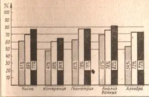 Рассмотрим диаграмму результатов выполнения школьниками из СССР заданий по каждой теме в сравнении со средним процентом верных ответов по всем странам, и по стране, давшей самые лучшие показатели по данной теме. Светлый столбик соответствует результату Советского Союза, самый темный столбик - максимальному результату, а заштрихованный - среднему результату по всем странам.