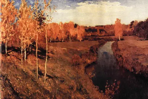 Картины Левитана середины 1890 г. - при всем при том, что сам художник в это время довольно сильно хандрил, - полны чувства радости, выражаемого в брызжущих с полотен ярких красках. "Золотую осень", свое известнейшее произведение, художник написал в тверском имении Горка, и построил его на смелых цветовых контрастах. Промытое до прозрачности голубизны небо, золото листвы, зелень пожухлой травы сливаются в нечто неотменимое и вечное - в красоту мира, очаровывающую и просветляющую человека.