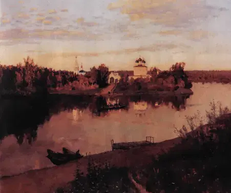 Год создания картины - один из самых счастливых в творческой судьбе Левитана. В том году он написал несколько прекрасных картин, во многом определяющих музыку его художественного мира. "Вечерний звон" - одна из них. Ее жанр можно определить как "церковный пейзаж" - таких пейзажей у Левитана несколько. Самый близкий по настроению, по "мотиву" - "Тихая обитель", появившаяся двумя годами ранее и вызвавшая столько восторженных толков. И там, и здесь "моделью" для художника послужил Кривозерский монастырь на Волге. Если "Тихая. обитель" являла собой некий застывший образ "русской благодати", ее символ, то в новом произведении Левитан попытался уйти от излишней символизации, приблизившись к живой жизни[3].