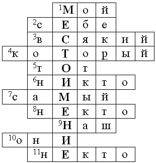1.Принадлежащий мне. 2. Возвратное местоимение в родительном падеже. 3. Опреде-лительное местоимение, синоним местоимений каждый, любой. 4. Вопросительное местоимение: какой по порядку. 5. Указательное местоимение, антоним местоимения этот. 6. Отрицательное местоимение: ни ты, ни я, ни он. 7. Определительное местоимение: именно, как раз. 8. Неопределенное местоимение, синоним местоимения кто - то . 9. Принадлежащий нам. 10. Личное местоимение 3 -го лица множественного числа. 11. Неопределенное местоимение: неизвестно кто.