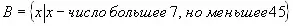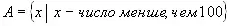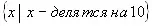 При этом мы наглядно видим, из каких элементов состоит множество. Но эта запись неудобна при описании множеств с большим числом элементов или множеств, число элементов которых невозможно перечислить полностью, то есть - бесконечных множеств. Например, невозможно записать все элементы множества чисел, которые делятся на 10. В этом случае множество записывается так: