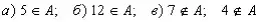 в) два элемента принадлежащих и множеству А и множеству В; г) два элемента не принадлежащих ни множеству А ни множеству В. - Придумайте и запишите какое-нибудь множество. Выпишите два элемента принадлежащих этому множеству и два элемента не принадлежащих этому множеству.