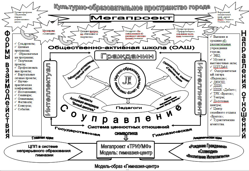 Модель-образ "Гимназия-центр" представлен мегапроектом "ТРИУМФ", составляющими которого являются 3 метапроекта как три будущих системных модели исследования разделов конкретного объекта. Их ценностная ориентация принадлежит категориям "Гражданин, Интеллектуал, Интеллигент", которые рассматриваются через ценностные ориентиры "Человек, Культура, Творчество".