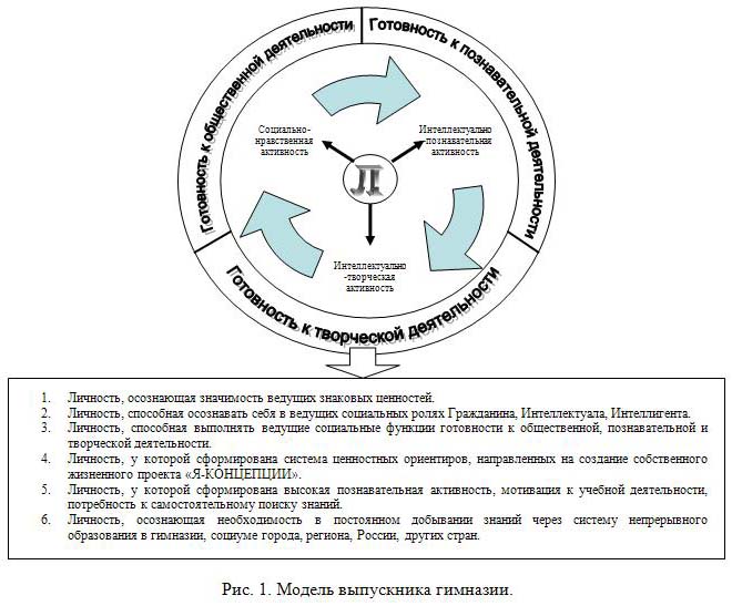 В процессе моделирования воспитательной системы школы, параллели, класса важно видеть и представлять себе весь целостный продукт на каждой возрастной ступени, который создается командой единомышленников на протяжении 11 лет. Он представлен общей моделью выпускника гимназии (рис._2).