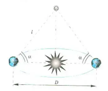 При определении расстояния до звезды в качестве базы можно использовать диаметр орбиты Земли, вращающейся вокруг Солнца (рис. 4).