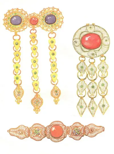 Материалом для ювелирных изделий служали: серебро, золото, самоцветы, искусственные камни и цветное стекло.