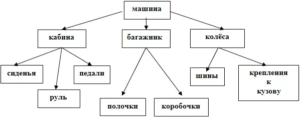 Первый уровень: кабина, багажник, колёса. Второй уровень: кабина - сиденья, руль, педали; багажник - полочки, коробочки; колёса - шины, крепления к кузову.