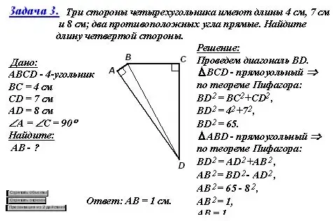 Задача 3. Три стороны четырехугольника имеют длины 4 см, 7 см и 8 см; два противоположных угла прямые. Найдите длину четвертой стороны.