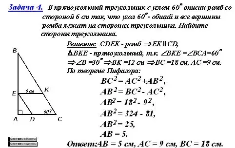 Задача 4. В прямоугольный треугольник с углом 60° вписан ромб со стороной 6 см так, что угол 60° - общий и все вершины ромба лежат на сторонах треугольника. Найдите стороны треугольника.