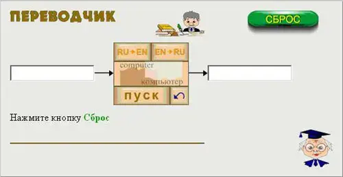 При нажатии кнопки Сброс задается слово. Необходимо выбрать направление перевода (Ru - En или En - Ru), ввести в левую ячейку заданное слово. Нажать кнопку Пуск для получения перевода.