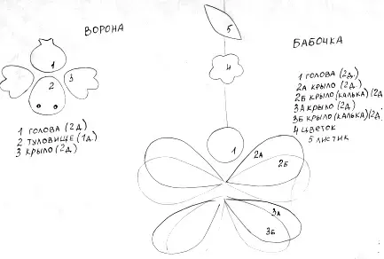 2. Приклеить крылья к прищепке. Проколоть в туловище с обеих сторон отверстия. Пропустить через них резинку (шпагат), нанизать бусинку и концы завязать узлом. Наклеить туловище.