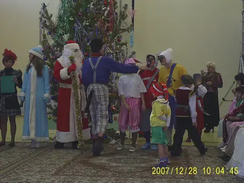 | Герои выводят по очереди ребят в красивых костюмах, Дед Мороз и Снегурочка раздают подарки. | ||