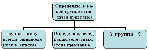 1 группа - приставки, которые пишутся всегда одинаково. Надо заучить и запомнить их. А вот о приставке С- разговор особый: не любит она проявлять себя при произношении. Поэтому надо запомнить следующее: если слышится З-, то надо писать С-. Приставки З- вообще не бывает!!!