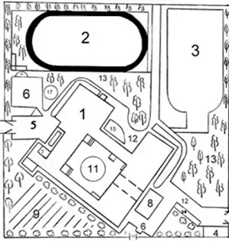 - Футбольное поле, площадка легкой атлетики, гимнастический городок, место для метания и прыжков в длину - летом, зимой - лыжня.