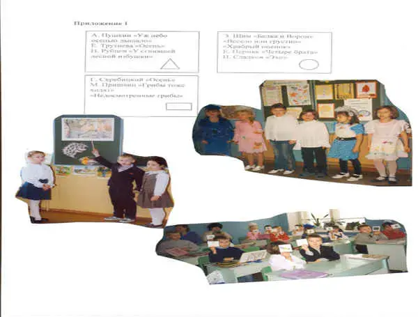 записи на доске: тема урока (табличка), иллюстрации к произведениям, фотомонтаж "Грибы", рисунки (3 поры осени), таблица "Белки осенью", выставка книг, портреты писателей, шапочки героев, карточки с названиями грибов, модели обложек к произведениям, творческие работы детей.