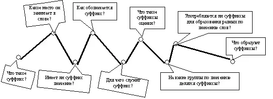 Урок начинается во время перемены, когда актуализируются знания учащихся. В качестве домашнего задания детям было предложено повторить известные суффиксы, вспомнить, что они обозначают. Таким образом, выявляется зона актуального развития (первые пять пунктов). Ребята заполняют своеобразный маршрутный лист, на котором обозначены вопросы (станции будущего путешествия).