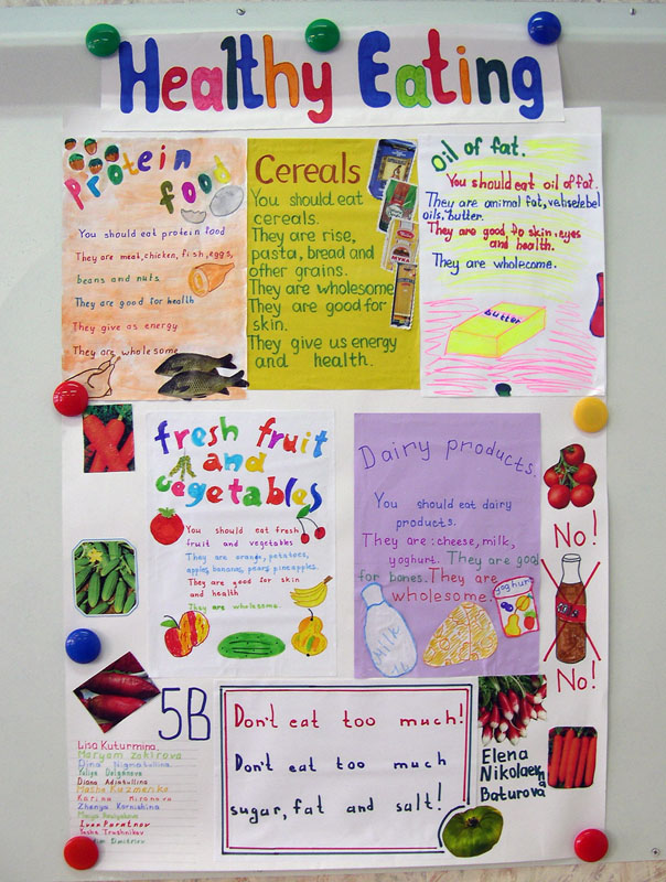 Кроме того, каждая пара предъявляет красочно оформленный мини-плакат с записью своего выступления и иллюстрациями. Плакат сразу же помещается на магнитную доску. По мере выступления детей на магнитной доске собирается большой единый плакат под заголовком "Healthy Eating". (Схема-опора составления высказываний - Приложение 4)