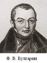 Булгарин Фаддей Венедиктович-писатель. Окончив Сухопутный кадетский корпус в 1806 г., Булгарин определился в уланский Государя Цесаревича полк, принял участие в кампании 1806 - 1807 г. Возвратившись из похода, Булгарин сочинил сатиру на полкового командира, за что его перевели в Кронштадтский гарнизонный полк, из которого в 1810 г. он перешел в Ямбургский уланский полк. В 1811 г. Булгарин был уволен из полка с плохой аттестацией, опустился нравственно, дошел до кражи, жил милостыней, пока не определился в польский легион Наполеона рядовым в полк, находившийся тогда в Испании. В рядах французской армии Булгарин принял участие в кампании, достигнув капитанского чина. В 1814 г. Булгарин был взят в плен прусскими войсками; после войны возвратился в Варшаву, из которой переехал в Санкт-Петербург, где ему было разрешено поселиться. С 1825 по 1859 годы издавал газету "Северная пчела". Булгарин известен своей борьбой против А. С. Пушкина и писателей его круга. В 1837 г. под именем Булгари-на вышла в свет книга, которая не имела успеха, её не покупали. В связи с этим Булгарин напечатал в "Северной пчеле" объявление, где широко рекламировал эту книгу. Данное событие и послужило поводом для возникновения лермонтовских эпиграмм.