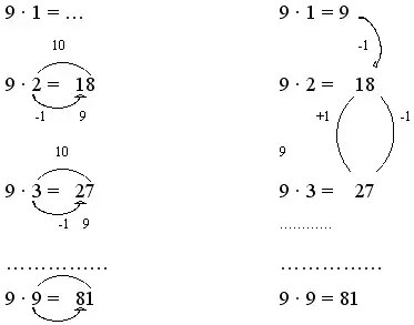Теперь можно предложить ученику не только вариант осознанного запоминания таблицы, но и прием: при умножении числа 9 на однозначное число большее 1, получится: