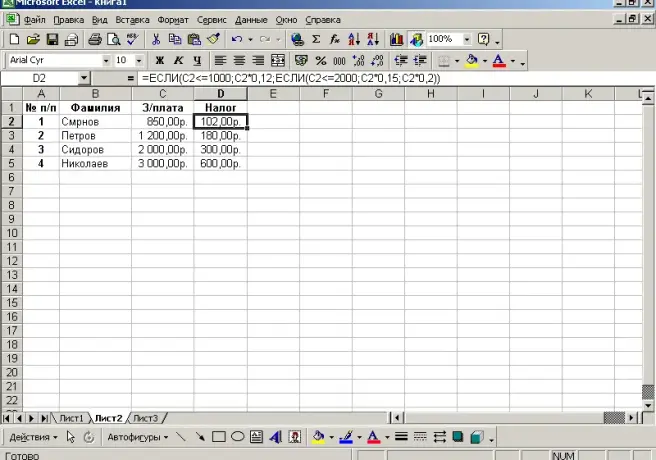 =ЕСЛИ(C2<=1000;C2*0,12;ЕСЛИ(C2<=2000;C2*0,15;C2*0,2))