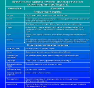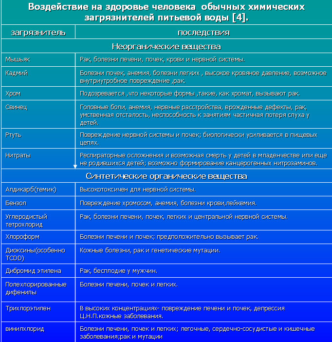 | Проследим по таблице как обычные химические загрязнители питьевой воды [4] воздействуют на здоровье человека | ![]() |