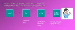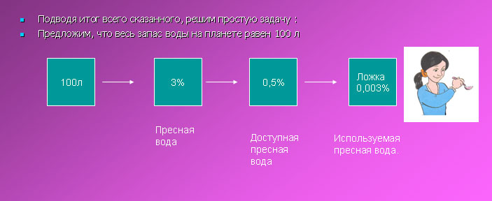 1. Ваши предложения по охране пресной воды? 2. Подводя итог всего сказанного, решим простую задачу: предложим, что весь запас воды на планете равен 100 л, пресной воды в ней - 3%, доступно для человека только 0,5% пресной воды. Сколько литров пресной воды используется человеком, если из доступной пресной воды человек может использовать только 0,003%? Сейчас мы выясним с вами, как природная вода способна самоочищаться в результате физического процесса - фильтрации. |