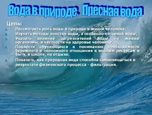 Вода - бесценное богатство, без нее невозможна жизнь на планете. Количество ежесуточно расходуемой человечеством пресной воды в настоящее время можно сравнить с годовой добычей всех полезных ископаемых. Но видимые громадные запасы воды, её доступность и дешевизна определили бездумное, бесхозяйственное отношение к ее использованию. А это может привести к катастрофе. Цели сегодняшнего урока: Рассмотреть роль воды в природе и жизни человека; Изучить методы очистки воды, а особенно питьевой воды; Указать влияние загрязнителей воды на живые организмы, в частности на здоровье человека; Подвести обучающихся к пониманию необходимости бережного и экономного отношения к водным ресурсам в быту, в школе, на отдыхе. Показать, как природная вода способна самоочищаться в результате физического процесса - фильтрации. |
