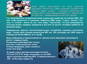 Вода нужна практически во всех отраслях народного хозяйства. Самый крупный потребитель воды в нашей стране - сельское хозяйство, на втором месте стоят промышленность и энергетика, на