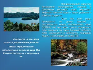 Несмотря на столь незначительный объем пригодной пресной воды, на каждого жителя земли все еще приходится 8,4 млн. литров воды. Но эти запасы уменьшаются, если мы все не начнем потреблять воду интенсивнее, чем восполняются ее запасы в результате ее естественного круговорота [4]. |