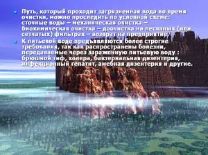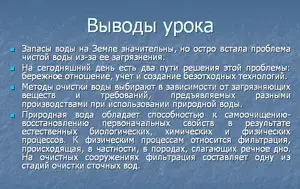 Запасы воды на Земле значительны, но остро встала проблема чистой воды из-за ее загрязнения. На сегодняшний день есть два пути решения этой проблемы: бережное отношение, учет и создание безотходных технологий. Методы очистки воды выбирают в зависимости от загрязняющих веществ и требований, предъявляемых разными производствами при использовании природной воды. Природная вода обладает способностью к самоочищению- восстановлению первоначальных свойств в результате естественных биологических, химических и физических процессов. К физическим