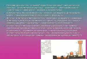 Поэтому путь очистки питьевой воды более длинный: механическая очистка - биохимическая очистка - осветление - обеззараживание - стабилизация - умягчение - возврат к потребителю. К механическим способам очистки относят : осаждение, фильтрацию, нефте- и маслоулавливание, отстаивание, флотацию. Физико-химические методы очистки включают осаждение с помощью химических реагентов, применения гидролиза, электролиза, ионного обмена, адсорбции, коагуляции, хлорирования, озонирования. Биологические методы бывают аэробные (проводятся при помощи аэробных микроорганизмов в биологических прудах, на биофильтрах, в аэротенках - огромных резервуарах из железобетона, в которых биологическим объектом выступает ил) и анаэробные (сбраживание органических остатков при помощи анаэробных микроорганизмов) [2]. |