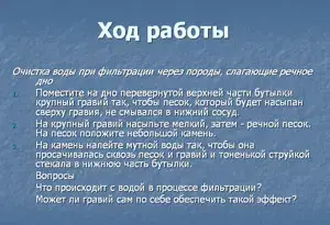 Методы: словесный, наглядный, практический Оборудование: компьютер, проектор, экран. Урок сопровождается компьютерной презентацией. На лабораторных столах учащихся: пластиковая бутылка, песок, гравий, мутная вода, картон, полиэтиленовый пакет, прозрачное резиновое кольцо, ножницы, набор фломастеров. |