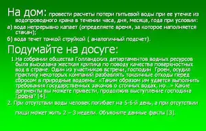 На дом: провести расчеты потери питьевой воды при ее утечке из водопроводного крана в течении часа, дня, месяца, года при условии: а) вода непрерывно капает (определяете время, за которое наполняется стакан); б) вода течет тонкой струйкой ( аналогичный подсчет). Подумайте на досуге: 1. На собрании общества Голландских департаментов водных ресурсов была высказана жесткая критика по поводу качества поверхностных вод в стране. Один из участников встречи, господин Гроен, осудил практику некоторых компаний разбавлять токсичные отходы перед сбросом в природные водоемы: "Таким образом им удается выполнить требования государственных законов о сточных водах, но…" Какие аргументы вы можете привести, продолжив выступление господина Гроена? [4]. 2. При отсутствии воды человек погибает на 5-6-й день, а при отсутствии пищи может жить 2 - 3 недели. Объясните данные факты [3]. |