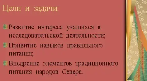 Ещё хотелось сказать несколько слов об особенностях питания человека в условиях Севера. Так как основой жизнедеятельности человека в любых климатических условиях является постоянный обмен веществ между организмом и окружающей средой обитания, то питание играет важную роль в адаптации человека к условиям Севера.