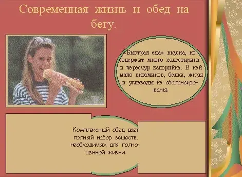 Большинство обрядов и правил приёма пищи, распространённых у разных народов, ведут к здоровому, упорядоченному питанию без спешки и суеты. Ныне же люди всё чаще склонны "перехватывать" на бегу. Всё бы ничего, будь обед из забегаловки полноценным. Однако предлагаемые там всевозможные "бюргеры", пирожки, другие блюда, хотя и вкусны, представляют, если употреблять их регулярно, серьёзную опасность для здоровья. В такой еде слишком много холестерина, она чересчур калорийна. К тому же сама атмосфера подобных заведений подталкивает к тому, чтобы есть, только не пережёвывая. А это вредно. Ведь человек глотает неизмельчённые и не смоченные слюной куски, с которыми желудку без большого напряжения не справиться. Кроме того, при торопливой еде медленнее наступает насыщение и можно сильно переесть, наскоро заталкивая в рот всё новые порции пищи. Наконец, в "быстрой еде" мало витаминов, а о сбалансированности белков, жиров и углеводов можно лишь мечтать. Поэтому лучше маминого борща, котлет и блинов ничего нет.