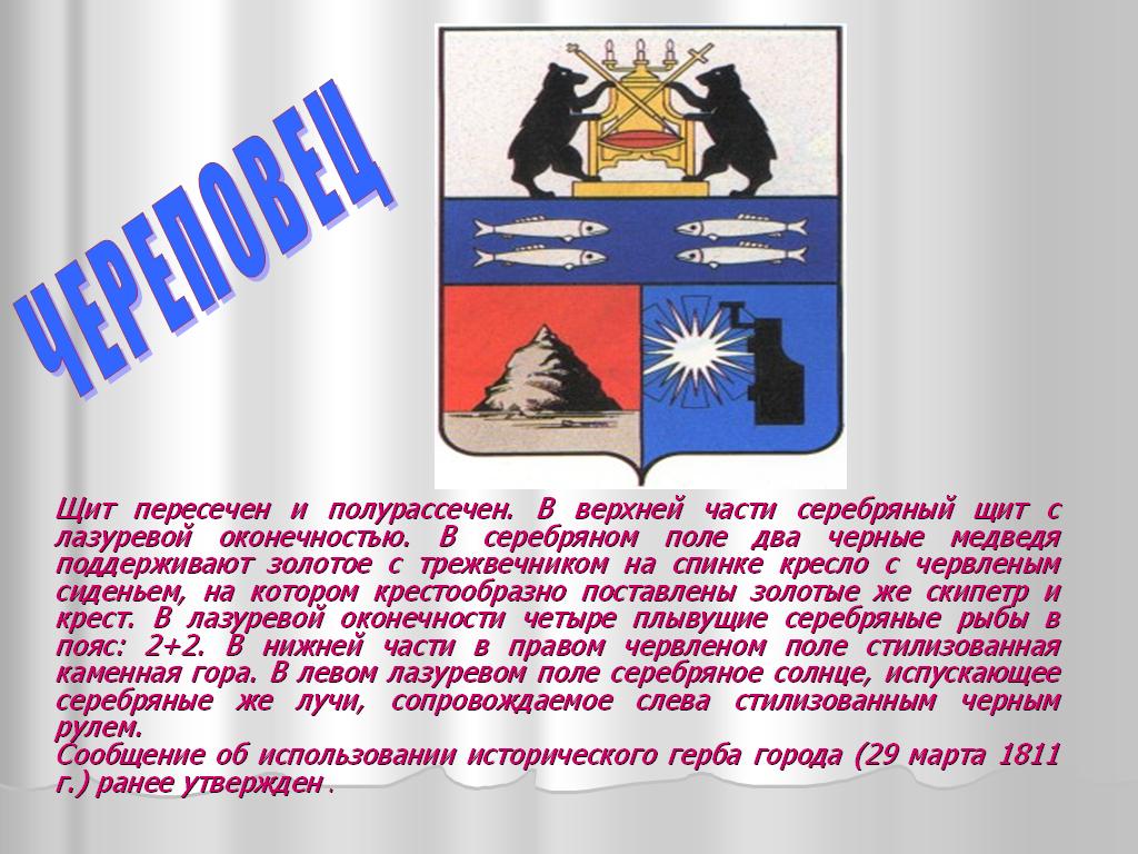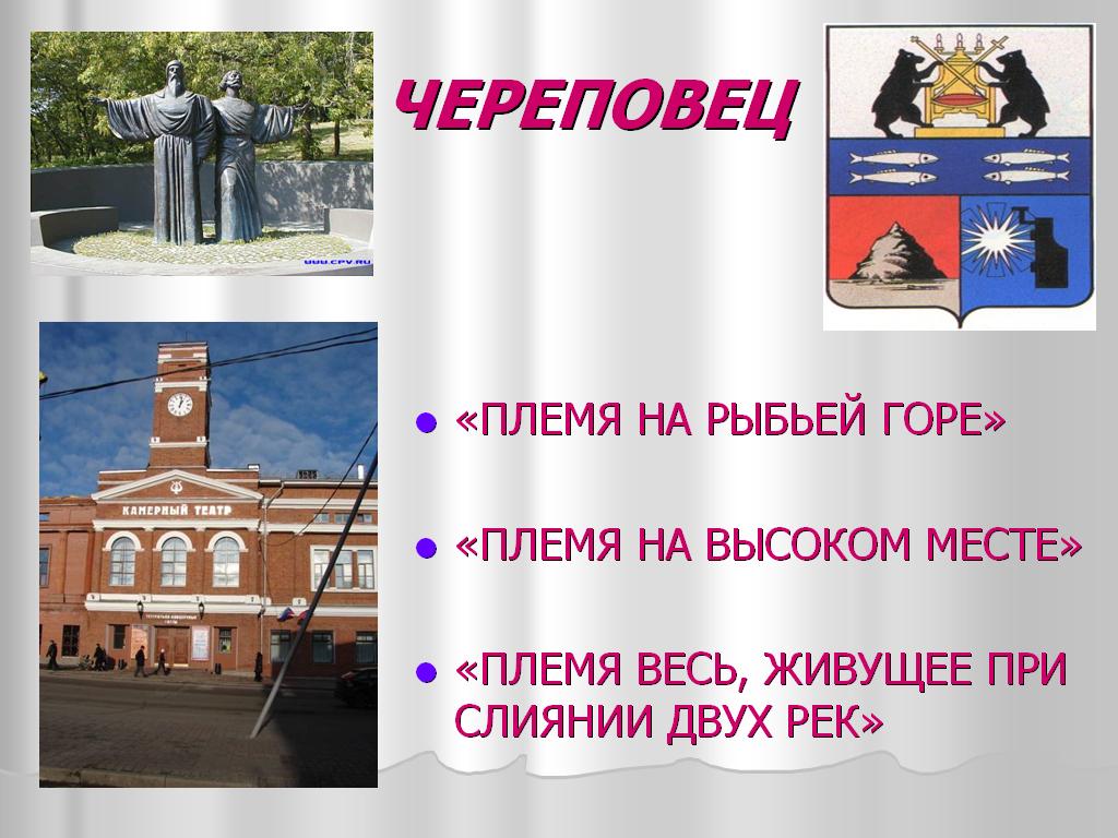 "Череповец" с вепского переводится как "племя на рыбьей горе". В переводе со славянского - "племя на высоком месте". Есть ещё одна версия: "Череповец" - слово финское и представляет собой соединение двух корней: "череп" и "вец". Что означает "племя весь, живущее при слиянии двух рек" <Рисунок 3>.