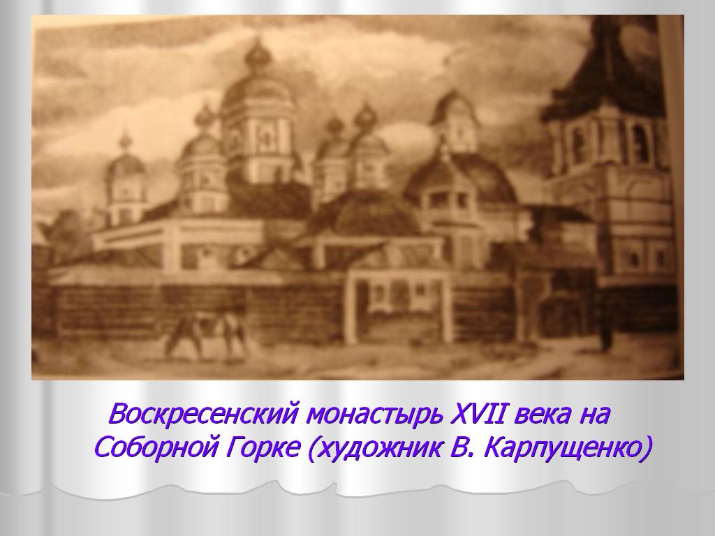 Летом 1362 года был основан Воскресенский монастырь <Рисунок 9>. Московские князья хотели создать крепкое христианское государство. Духовными и материальными центрами должны были стать монастыри. В них давали приют и душевное успокоение, помогали материально, учили грамоте, ремёслам. Во главе монастырей стояли мудрые, энергичные люди. Постройки монастыря в то время были деревянные, обнесённые бревенчатой стеной, а весь комплекс не ограничивался только Соборной горкой: северной границей был ручей или искусственный ров. На юге граница шла по большому рву, рядом с нынешним лесомеханическим техникумом. На западе владения доходили почти до района нынешней улицы Труда.