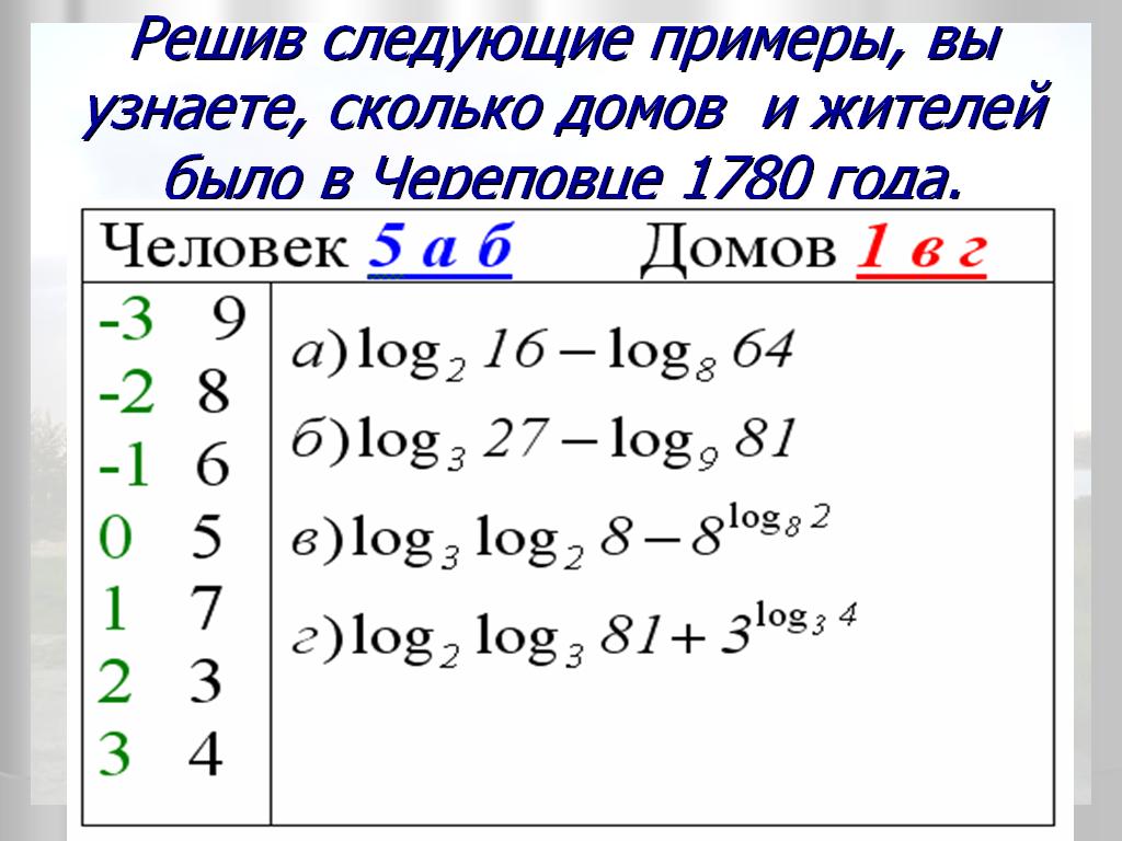 Выполнив преобразование логарифмических выражений, вы узнаете, сколько жителей и сколько домов было в нашем городе в 1780 году <Рисунок 22>, <Рисунок 23>.