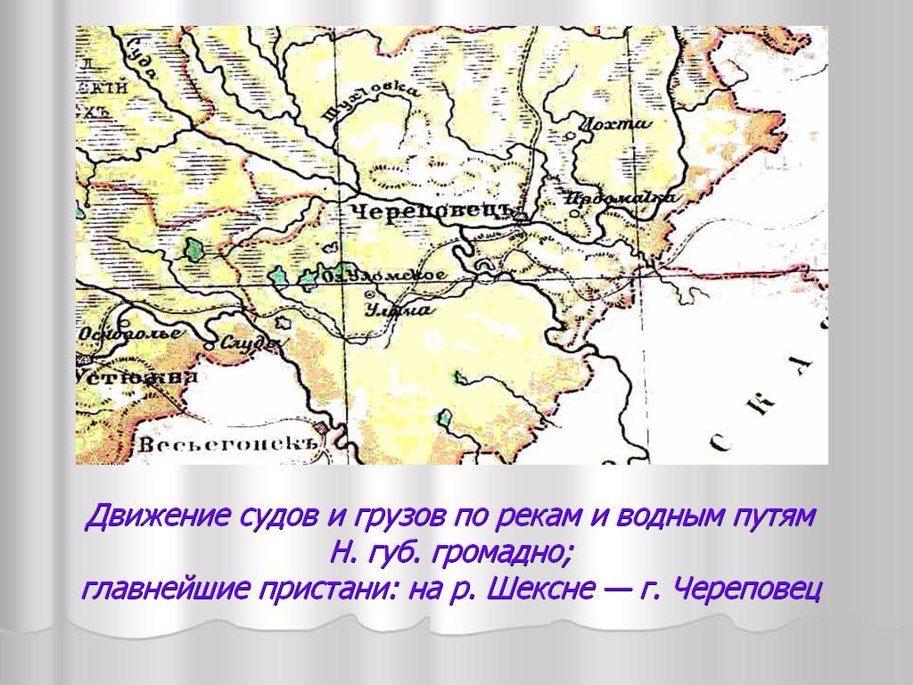 Важным событием в жизни города стало введение в эксплуатации Мариинской водной системы <Рисунок 27>. Эта система через каналы соединяла Волгу и Шексну с Петербургским портом, а через него с Балтийским морем. Теперь Шексна стала частью Мариинской системы на протяжении 397 вёрст <Рисунок 28>.